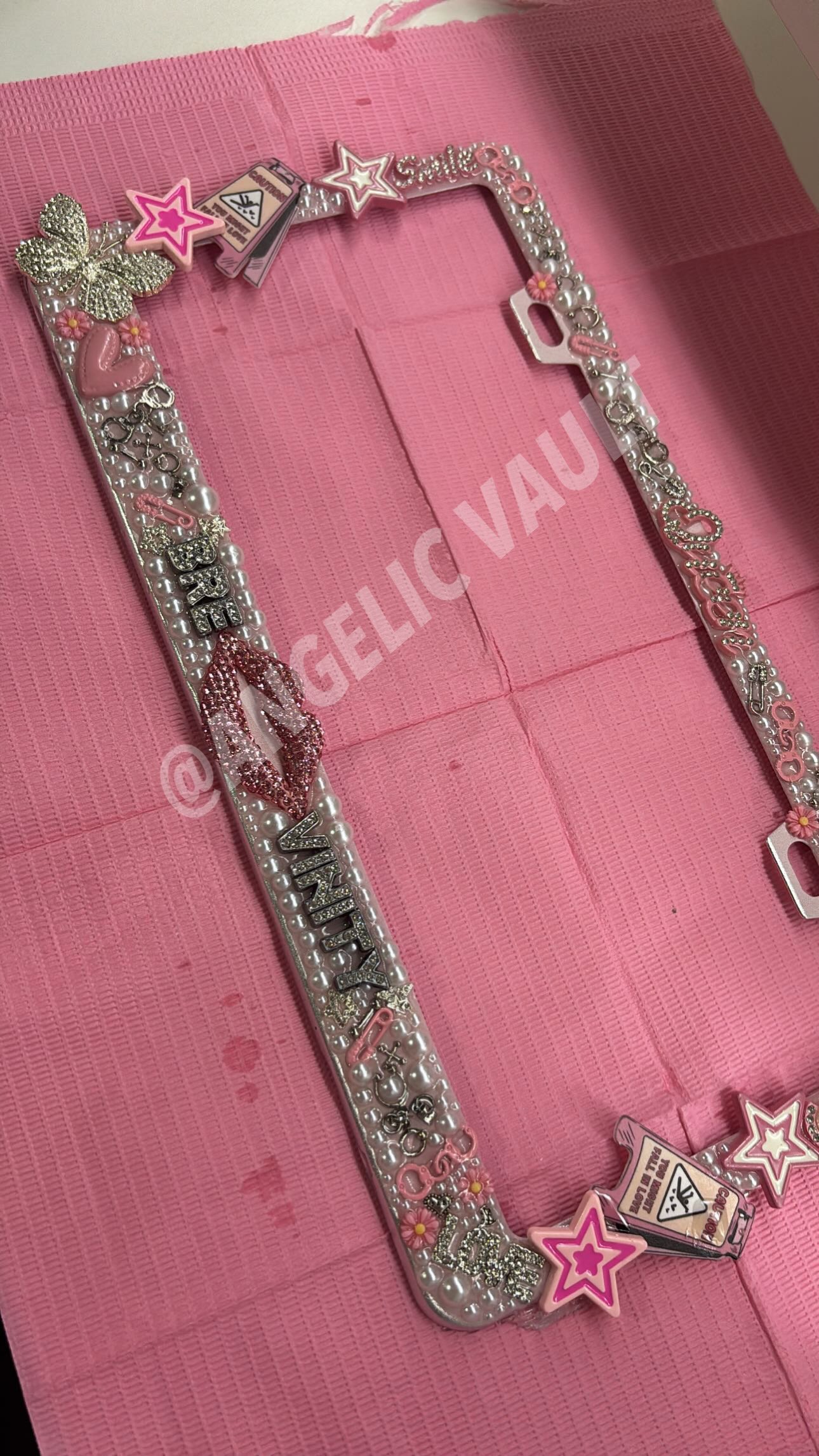 If you want to your own customized tag for your car, click here! Get it customized how you want, it may take 3-5 days to make depending on what charms you request or the color frame(tag) you may want.